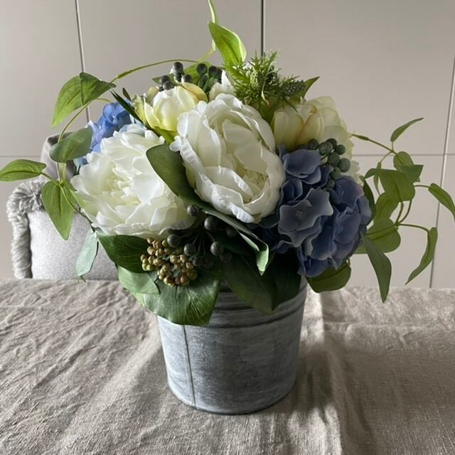 ホワイトのシャクヤクとブルーのアジサイがこれからの季節にぴったりのブーケ