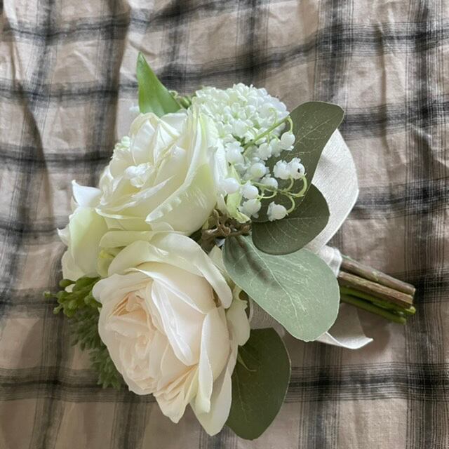 ローズと人気のスズランを使ったブーケ ラタンの花器プラスデコレーションマット付